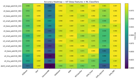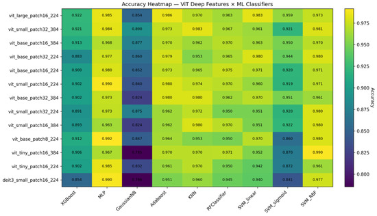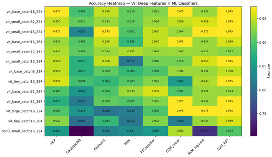 For the ML classifiers, we chose a representative mix of widely used families, including linear models (SVM with linear kernel), non-linear kernel-based models (SVM with RBF and sigmoid), probabilistic models (GaussianNB), distance-based learning (KNN), tree-based ensembles (Random Forest, XGBoost, AdaBoost), and neural-based models (MLP). This diversity allowed us to compare classical learners with strong baselines and modern ensemble methods, while also evaluating how well they complemented ViT-derived deep features.