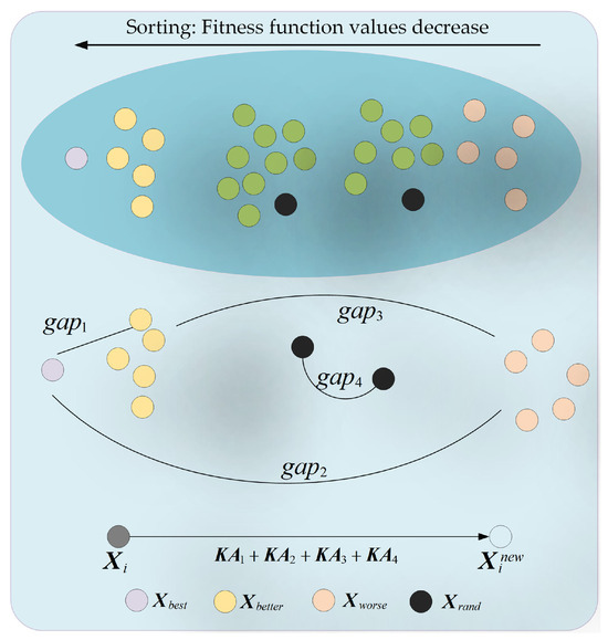This section primarily focuses on introducing the core idea and mathematical model of the adaptive exploration strategy. The main concept behind the adaptive exploration strategy is that members learn from the disparities between themselves and others with different attributes, while also taking into account the members’ learning capabilities and the acceptability of these disparities, in order to enhance the algorithm’s GE capability. The schematic diagram of the adaptive exploration strategy is illustrated in Figure 1. Specifically, in the adaptive exploration strategy, four distinct types of disparities are considered: the disparity between the ideal member and a relatively superior member (), the disparity between the ideal member and a relatively inferior member (), the disparity between a relatively superior member and a relatively inferior member (), and the disparity between two different randomly selected members (). These disparities are represented using Equation (9).