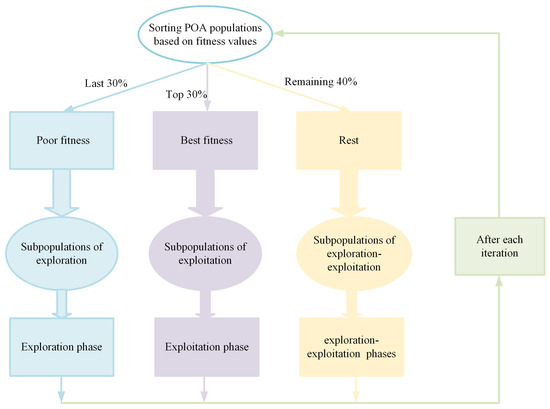 As the dimensionality of the FS problem increases, the algorithm needs to search through an exponentially growing number of feature subset candidates when resolving the FS problem. This necessitates a well-balanced exploration and exploitation stage in the algorithm, enabling it to effectively locate local regions while further exploring these regions to enhance the CA of the feature subset. When the primordial POA is applied to resolve the FS problem, its CA is compromised due to an inadequate balance between the GE and LE stages. To alleviate this issue, there is an urgent need for us to advance a solution that can enhance the balance between the two stages. Fortunately, Shen et al. [75] introduced the concept of multi-swarm evolution in their work. By dividing the swarm into sub-swarms with distinct characteristics and then enabling each sub-swarm to undergo targeted updates, they effectively improved the balance between the two stages during the algorithm’s execution. Inspired by this idea, this section adopts the same concept of utilizing a three-swarm search strategy to improve the balance between the GE and LE stages. Specifically, by considering the FFV of members in the swarm, they are divided into three sub-swarms; the proportion for swarm division mainly adopts the concept of averaging. Specifically, the entire swarm is divided into three sub-swarms in a ratio of 3:4:3. This approach not only effectively preserves the members’ GE capabilities but also augments their LE abilities, thereby contributing to the balance during the algorithm’s execution process. The set of members ranking in the top 30% in terms of FFV is classified as the exploitation sub-swarm. LE operations are performed on this sub-swarm to enable better tuning of CA within local regions. Secondly, the set of members ranking in the bottom 30% in terms of FFV is classified as the exploration sub-swarm. GE operations are carried out on this sub-swarm to facilitate exploration across a wide range of solution spaces, thereby enhancing the algorithm’s GE capability. In addition, the remaining members are classified as the exploration–exploitation sub-swarm. Both GE and LE behaviors are simultaneously applied to this sub-swarm to achieve a better balance between the GE and LE stages of the algorithm, enhancing its ability to escape from local sub-ideal feature subset traps. This swarm division process is illustrated in Figure 2.