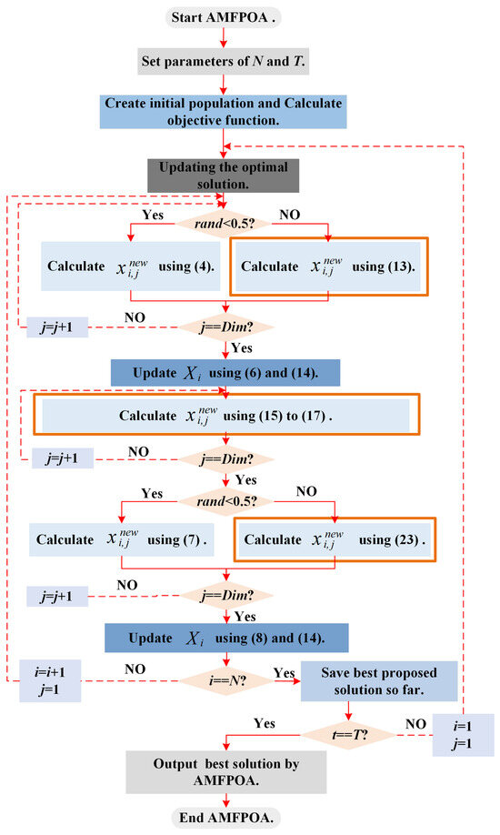 Below, we will conduct a detailed analysis of the steps involved in employing the AMFPOA to resolve optimization problems, as depicted in Figure 5.