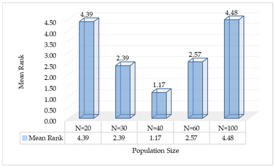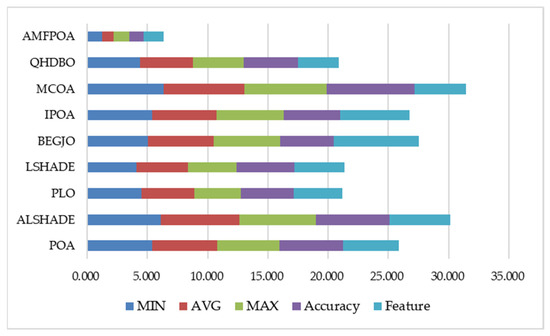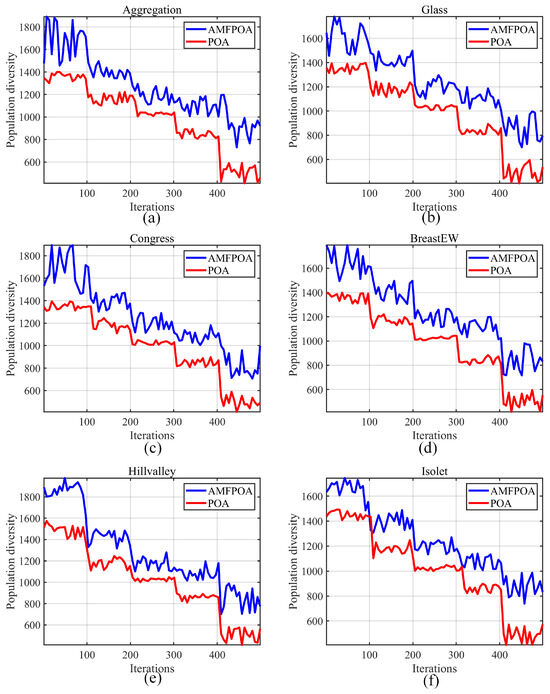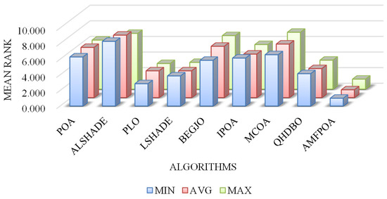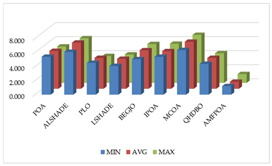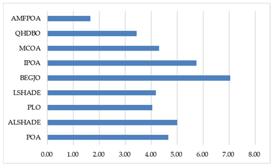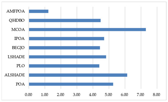 This subsection primarily focuses on comparing the time complexity of the AMFPOA and POA. In the primordial POA, there are two main components: swarm initialization and algorithm iteration. Here, we use the evaluation of the FFV as the fundamental step for time-complexity estimation. In the initialization stage, the time complexity is , where represents the number of members in the swarm, and signifies the dimensionality of each member. During the iteration process, the time complexity for a single iteration is . Therefore, for iterations, where represents the MN of iterations of the algorithm, the time complexity is . Consequently, the overall time complexity of the POA is . The initialization process of the improved AMFPOA has the same time complexity as that of the POA, which is . During the iteration process, the member position-updating method in AMFPOA is combined with the updating method of the primordial POA in an equal-probability manner. Considering the evaluation of the FFV as the basic step, the time complexity of its iteration process remains . Thus, the time complexity of the AMFPOA is also , which is the same as that of the POA. The above analysis is based on taking the evaluation of the FFV as the basic step to calculate the time complexity of both the AMFPOA and POA, and there is no significant difference between them. However, from the perspective of program execution, in the AMFPOA, necessary intermediate variable calculations are required before a member updates its position. This will increase its computational cost. Nevertheless, the difference in computational cost between AMFPOA and POA does not span orders of magnitude and can be considered negligible. We deem this acceptable, as it means sacrificing a small amount of time in exchange for a higher accuracy return.