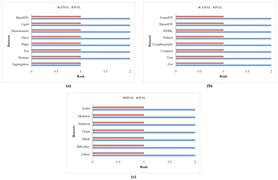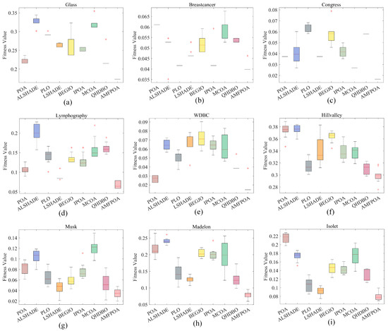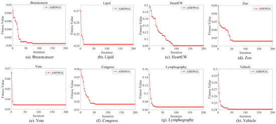 This section primarily focuses on evaluating the FS efficacy of the AMFPOA. We conducted experiments on 23 real-world FS datasets and compared the results with eight state-of-the-art algorithms to comprehensively assess the FS efficacy of AMFPOA. The detailed knowledge of the 23 FS datasets is presented in Table 3, and the specific parameters of the eight comparative algorithms are outlined in Table 4. Moreover, to ensure the rationality of the experiments, each experiment was independently and non-repetitively run 30 times. We objectively and comprehensively evaluated the FS efficacy of AMFPOA by analyzing the FFV, CA, feature subset size, and Friedman non-parametric test results obtained from these 30 experimental runs. Additionally, to maintain fairness in the comparative experiments, the swarm size was set to 40, and the MN of iterations was set to 100. All experiments involved in this paper were coded and executed using MATLAB R2021b on a WINDOWS 11 operating system. Below, we will provide a detailed analysis of the FS problem model and the experimental results. Before explaining the experiment, we describe the detailed knowledge of the comparative algorithm.