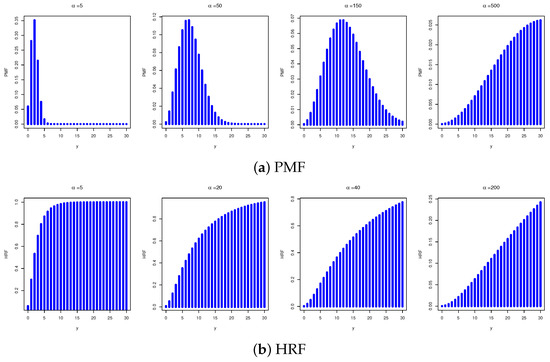 respectively. Upon several levels of DMB(), Figure 1 displays various shapes of the PMF and HRF for the DMB distribution.