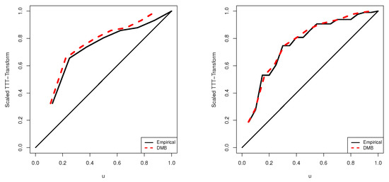 To infer the form of the hazard rate and to provide a graphical diagnostic for assessing the fit of lifetime distribution models in survival and reliability analysis, the scaled TTT-transform plots for Data-i, are shown in Figure 8. It reveals that both datasets 1 and 2 show an increasing failure rate, which is one of the DMB failure rates depicted in Figure 1.