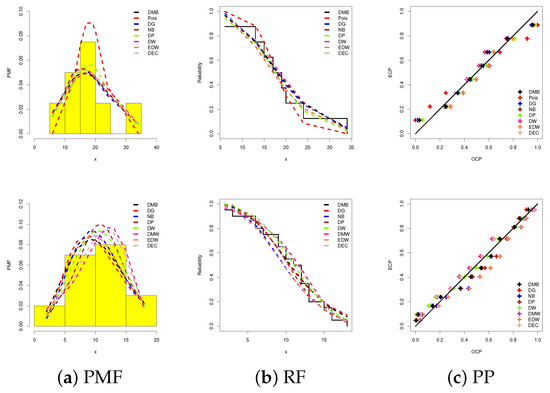 Goodness-of-fit visualization techniques serve as valuable diagnostic tools for evaluating the concordance between empirical data and a proposed theoretical distribution. For this purpose, in Figure 9, we demonstrate the superior performance of the DMB model through the application of three key graphical evaluation methods: (i) lines representing fitted probability mass lines with data histograms, (ii) fitted reliability function lines, and (iii) probability–probability (PP) lines.
