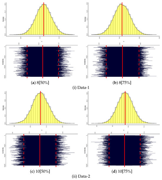 A main issue in utilizing the MCMC methodology is verifying that the simulation has achieved satisfactory convergence. To this end, Figure 10 displays both the trace plots and posterior density estimates for the parameter . Each panel includes the posterior mean (represented by a solid red line) and the 95% BCI bounds (shown as dashed red lines), providing a visual assessment of convergence and the underlying distributional characteristics. The plotted outcomes suggest that the proposed M-H approach attains reliable convergence, with the resulting DMB posterior distributions exhibiting approximate symmetry across samples from Data-. Additionally, Table 11 presents a comprehensive summary of key statistics for , derived from 30,000 iterations of the MCMC algorithm. Notably, the results in Table 11 support the numerical findings reported in Table 10 and behave similarly to the facts shown in Figure 10.