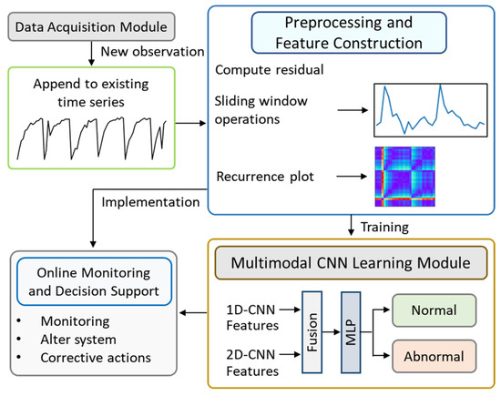 Recent advances in multimodal deep learning have demonstrated that fusing complementary data sources can significantly improve model performance [9,10]. Inspired by these approaches, this study proposes a multimodal convolutional neural network (CNN) that integrates information from both raw one-dimensional (1D) time series data and their corresponding two-dimensional (2D) recurrence plots, capturing both temporal and spatial features [11,12,13]. This architecture enhances the model’s ability to differentiate between normal operating conditions and various abnormal states that may reflect concentration deviations or process instabilities. The multimodal CNN is trained to perform multi-class classification, providing actionable insights for real-time diagnosis and process correction.