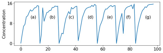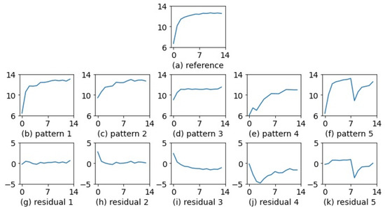 Figure 6 illustrates the distinct residual patterns associated with normal and abnormal conditions, as analyzed in this study. Figure 6a illustrates the standard concentration pattern, serving as the reference. Figure 6b displays the time series of concentration values under normal conditions, referred to as Pattern 1 (P1). Figure 6g shows the residuals obtained by subtracting P1 from the standard pattern, characterized by fluctuations around zero.