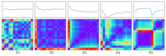 Iwanski and Bradley [41] conducted a systematic analysis of the structures represented by recurrence plots and concluded that RPs constructed with different embedding dimensions convey equivalent information, rendering higher-dimensional phase spaces unnecessary. Accordingly, the embedding dimension was set to 1 in this study. To preserve a larger RP image size and retain essential features, a window size of = 28 was adopted in this study. The choice of 28 is based on both domain knowledge of the PCB etching process and empirical performance evaluation. In our production setting, the etchant replenishment cycle is approximately 14 time units. Setting the window to 28 captures two consecutive replenishment cycles, which is important for distinguishing between normal variations and emerging abnormal patterns. Figure 4 shows the texture images generated through recurrence reconstruction of the chemical solution concentration patterns.