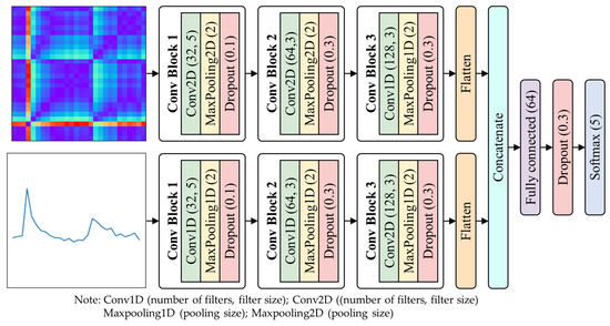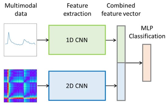 In late fusion with a simple concatenation strategy, the outputs from both branches are merged and passed through fully connected layers, followed by a Softmax activation function for multi-class classification. Figure 5 depicts the architecture of the multimodal CNN, which processes both 1D and 2D inputs through parallel convolutional branches. The feature representations extracted from the 1D-CNN and 2D-CNN are concatenated into a unified feature vector, which is subsequently fed into a multi-layer perceptron (MLP) classifier for final prediction.