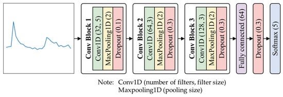 Figure 8 summarizes the architecture of the 1D-CNN model, which comprises 12 layers in total. The first nine layers are dedicated to convolution operations for feature extraction from the input data, while the final three layers function as a classifier that utilizes the extracted features for prediction. The output layer employs a Softmax activation function with five neurons, corresponding to the five target classes.