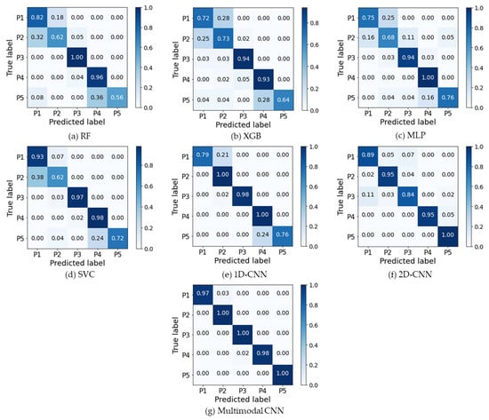 In addition to standard evaluation metrics, it is important to examine each classification model’s performance under both normal and abnormal conditions using a confusion matrix. Figure 10 shows the confusion matrices of various classification models obtained under a specific experimental setting. As illustrated, the confusion matrix reveals that the multimodal CNN not only achieves strong overall performance but also maintains high classification accuracy across all classes. Unlike traditional models, which tend to misclassify rare fault types, the multimodal CNN maintained consistent classification performance, suggesting robustness to real-world imbalance scenarios.