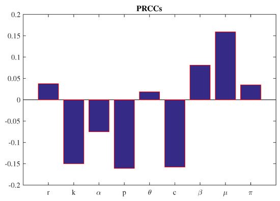 For crop biomass X, the PRCC results highlight several key parameters: and . From Figure 1, it is clear that and exhibit positive correlations with biomass, while the remaining parameters show negative associations.