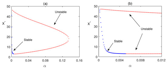 The feasible roots of Equation (15) are analysed using Figure 2a,b. We observe that two feasible interior equilibria exit but one is stable and another is unstable, i.e., bistability does not occur.