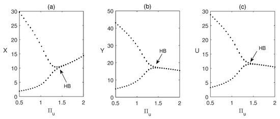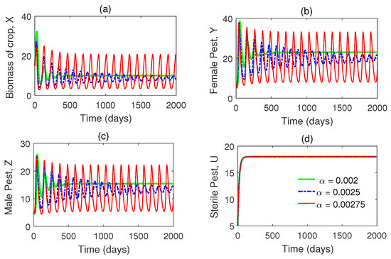 Another time series plot is shown in Figure 5a–d for different values of the rate of release of sterile male pests, . We have taken , which means there is already periodic oscillation in the system. Now we increase the value of and see that the system becomes stable. Thus, we conclude that the role of is to stabilize the system. In Figure 6a–c, we have plotted a Hopf bifurcation diagram for . The stability switch is observed from unstable to stable when is increased from to 2.