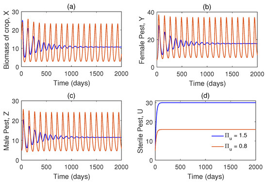 The proposed model has one equilibrium, the coexisting equilibrium. Stability analysis shows that the point is globally asymptotically stable when the consumption rate is lower or the recruitment rate is higher. Hopf bifurcation can be observed when the rate of crop consumption by pest, is higher. The critical value of depends on the other parameters of the system (Figure 8). The proposed optimal control problem shows that pests can be minimized by introducing sterile male pests into the system when sterile pests are introduced at an optimal rate.