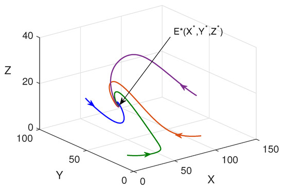 In Figure 7, phase portraits are plotted in different phase planes taking different initial values of the populations. It is observed that all trajectories converge to the same point (interior point, ). This shows that for the set of parameter values, the system is globally asymptotically stable.
