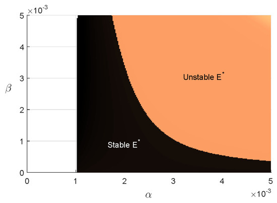 Regions of stability (two-parameter bifurcation) of the coexisting equilibrium are shown in the parameter plane. Figure 8 shows that the region of stability decreases when the parameter values are increased. Note that Equation (15) has two feasible roots. One is always unstable; the other one is stable in the green region and unstable in the yellow region. This figure also shows that the critical value of for the occurrence of Hopf bifurcation depends on the value of .