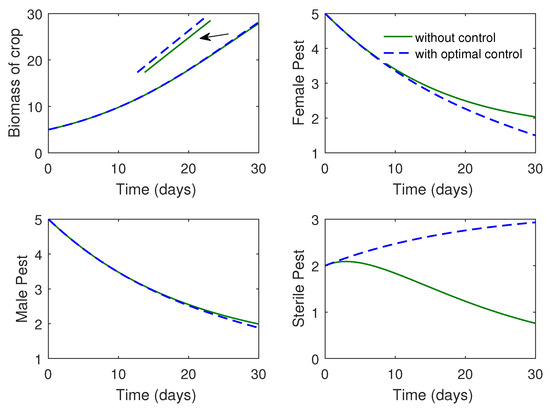 The proposed optimal control problem is solved numerically in Matlab using bvp4c solver. The results of the optimal control problem are plotted in Figure 9 and Figure 10. We compare the results between the system with and without control in Figure 9. From Figure 5, we observe that the recruitment rate of sterile pests (i.e., ) reduces the total pest population (male and female pests).