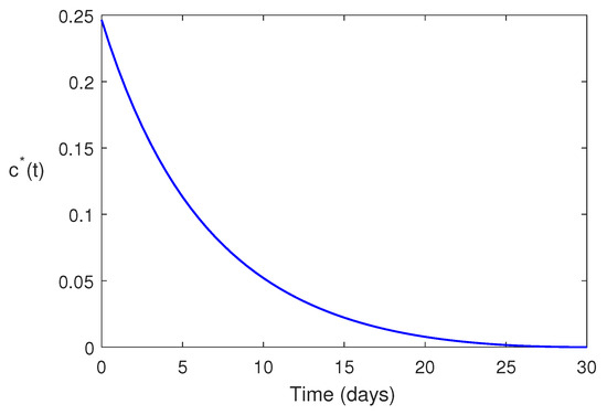 Here, we have shown that optimal use of sterile pests can minimize the pest population with minimum cost (Theorem 4). The optimal profile of the control variable is plotted in Figure 10. This shows that to minimize the cost of pest management, we should follow the trajectory of to release sterile pests. This figure shows that initially the release rate should be high, then we have to gradually decrease the rate of release as the female pests are decreasing due to this approach.