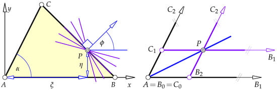 In principle, the parameter is allowed to trace freely. However, results in an open triangle (cf. Figure 1, right), the vertex is at infinity, and is either anti-parallel to (if ) or parallel to (if ). If , the line carrying passes through A and the corresponding two triangles are point-shaped (see also Figure 1). Finally, if , we obtain the second pair of open triangles (cf. Figure 1).