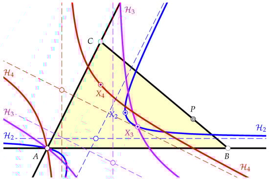 It is rather elementary to verify that the latter is the equation of a hyperbola. The equations of its asmptotes are the linear factors of the quadratic form, see []. This makes clear that passes through the ideal points of the lines orthogonal to and . is centered at