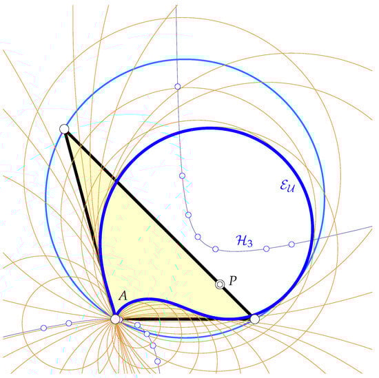 Both curves and have an ordinary node at A, since A can be viewed as a “singular” triangle in . Figure 8 shows the curves and .