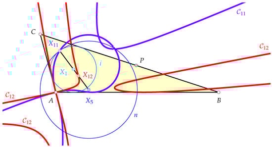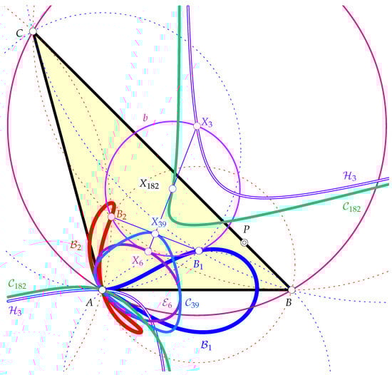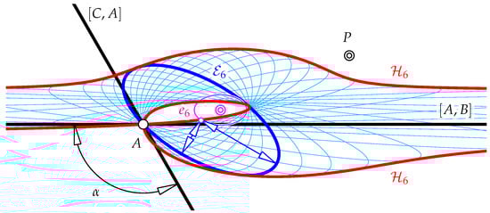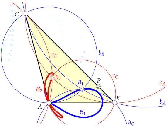 The harmonic conjugate of with respect to and is known as the center . We shall not write down its implicit equation due to its length. However, the curve is a rational quartic with an ordinary double point at A and two further ordinary double points. The curves and for a particular choice of can be seen in Figure 9.
