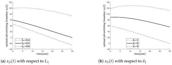 Similarly, Panel (b) indicates that as increases, the switching boundary shifts downward. With fixed , a larger raises the income from job , thereby reducing the relative income advantage of job . As a result, the incentive to remain in job weakens, and the agent already finds it optimal to switch to job at a lower wealth level. In other words, because job offers higher income when is larger, the trade-off between income from job and leisure gain from job is resolved earlier, leading to a lower switching boundary.