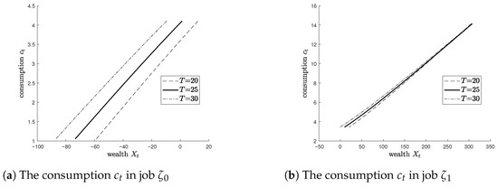 Panel (b) presents similar results for job . Although this job provides lower income, the qualitative pattern remains consistent: consumption increases in both wealth and T. However, the slope is flatter, reflecting the smaller marginal value of additional labor income when income is low. That is, the additional implicit wealth from increasing T is less significant under job , leading to more modest increases in optimal consumption.