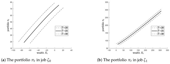 Panel (b) presents the case for job , where labor income is lower. Although the same positive relationship between T and is observed, the increase in investment is more modest. The lower labor income implies a weaker buffer effect, limiting the extent to which the agent can increase risky asset exposure. Consequently, the overall portfolio level is lower, and the sensitivity to T is diminished compared to the case of .