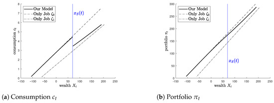 Figure 4 compares the optimal consumption and portfolio allocation across three models: (i) our main model with endogenous job-switching, (ii) a fixed-job model where the agent always remains in job , and (iii) another fixed-job model where the agent always remains in job . The vertical blue line denotes the switching boundary : when wealth exceeds this threshold, the agent optimally switches from the high-income job to the high-leisure job .