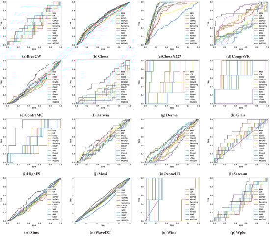 We selected widely used metrics in outlier detection to assess the performance of the algorithms. The receiver operating characteristic (ROC) curve [] is employed to illustrate the diagnostic ability of a binary classifier system, as its discrimination threshold varies. It plots the true positive rate (TPR) against the false positive rate (FPR) at different threshold settings, providing a comprehensive view of the trade-off between sensitivity and specificity. ROC curves are particularly useful in scenarios where the positive and negative class samples are relatively balanced, as they clearly show how well a model separates the two classes.