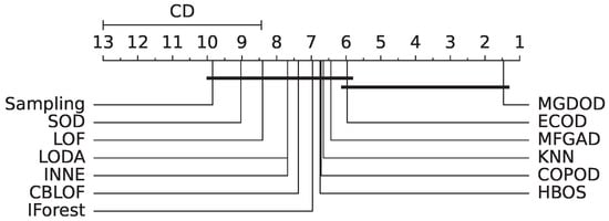 Following this, we conducted the Nemenyi post-hoc test to identify which pairs of algorithms differ significantly. With , the critical value  is 3.314, leading to a computed critical difference (CD) of 4.561. As shown in Figure 2, MGDOD achieves the best average rank and is clearly separated from the majority of baseline methods, indicating its statistically superior performance.