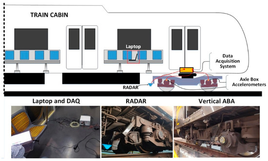 The train was instrumented with a data acquisition system (DAS) and a laptop computer. The DAS, based on the architecture proposed by Cano-Moreno et al. [39], was adapted by replacing the Odroid board with a Raspberry Pi 3B (Figure 2). This system recorded vertical acceleration at the axleboxes of the two axles of the front bogie, as well as the train’s linear speed, using a GSS15C Doppler sensor installed on the bogie frame.