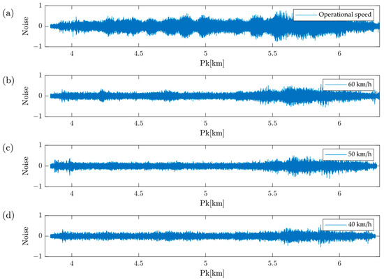 Figure 4 presents the relationship between acoustic signals and their kilometer position for the operating speed (75 km/h) and speeds of 60 km/h, 50 km/h, and 40 km/h. The signals show a progressive decrease in noise amplitude as the train speed is reduced, reflecting a decrease in the dynamic excitations generated by the wheel–rail interaction at lower speeds.