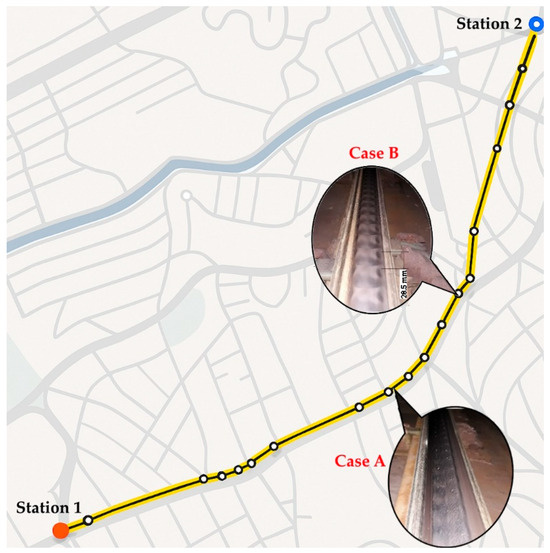 The experimental design was carried out on a railway section between Stations 1 and 2, covering kilometer points (Pk) 3.798 to 6.246. During the tests, runs were performed at different speeds, including the train’s nominal operating speed (75 km/h) and reduced speeds of 60, 50, and 40 km/h. The nominal operating speed corresponds to the normal commercial service conditions of the line, while the reduced speeds were intentionally selected to represent realistic scenarios where operational constraints—such as traffic density, temporary speed restrictions, maintenance activities, or specific scheduling requirements—may require trains to operate below nominal speed. This approach allowed for the evaluation of dynamic and acoustic signal behavior under different excitation levels, ensuring a detailed and representative analysis for the development of the automated methodology.