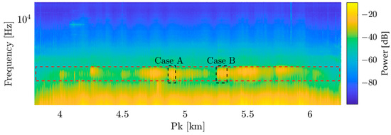 The acoustic recordings were analyzed in the frequency–space domain using spectrograms to locate high-energy bands associated with areas of annoying noise (red box in Figure 6). These areas coincided with positions previously identified through visual inspection (black boxes) and were confirmed by directly listening to the audio files. The color scale (colorbar) in the spectrogram represents the power spectral density (dB), ranging from −80 dB (blue, low energy) to −20 dB (yellow, high energy), enabling direct quantitative interpretation of the acoustic intensity along the track.
