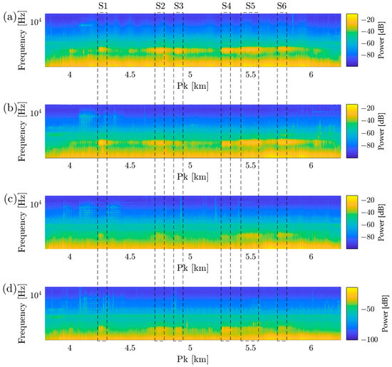 - De Rosa et al. [30]: The spectrogram reveals areas with energy patterns compatible with corrugation, especially at high speeds. However, its interpretation requires prior experience, and at low speeds, key responses are lost (such as S5 at 60 km/h or S6 at 40 km/h).