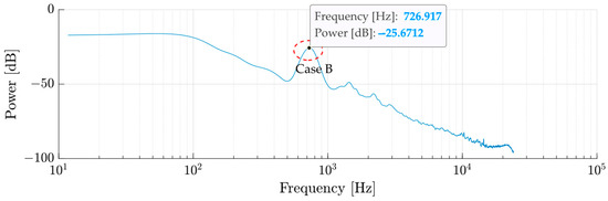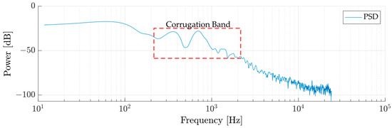The identified sections were individually processed in the frequency domain using power spectral density (PSD). Figure 8 shows the spectrum of the fourth segment under analysis (S4), recorded at the operating speed (75.8 km/h). This segment corresponds to Case B identified during visual inspection (Figure 5). The spectral analysis revealed a local maximum at 726.9 Hz, equivalent to a wavelength of 28.96 mm, which is consistent with the estimate obtained by visual inspection.