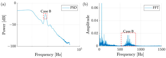 Representation of the sound spectrum for the same track segment (Case B): (a) power spectral density (PSD) showing local maxima and (b) fast Fourier transform (FFT) highlighting clustered impulsive components.