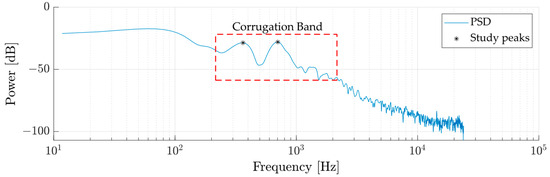 Based on the average speed of each window , the corrugation frequency band corresponding to wavelengths between 10 and 100 mm is determined by applying Equation (2). As an example, Figure 10 illustrates the frequency band of interest within the spectrum for a speed of 77.5 km/h, equivalent to a range from 215 to 2154 Hz.
