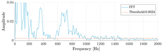 For each window , a dynamic impulsiveness threshold is calculated based on the statistical distribution of amplitudes in the full spectrum [43]. Let A denote the full spectral amplitude vector of the segment (i.e., the entire FFT spectrum, not limited to the corrugation study band). First, the median of A is computed and used as a robust baseline to mitigate outliers and define candidate local peaks. Next, the mean amplitude of the local peaks whose values exceed the median is taken as the dynamic impulsiveness threshold Timp. In the example shown in Figure 12, this procedure yields a threshold value of 0.0024, which corresponds to the mean amplitude of the peaks exceeding the median in the analyzed segment.