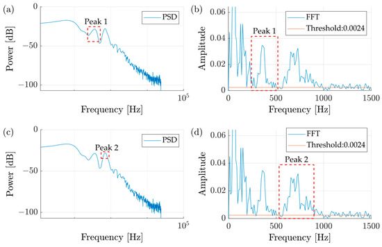 The study peaks shown in Figure 11 fall within the corrugation frequency band (red box), calculated for each segment from its average speed and target wavelength range (10–100 mm) using λ = V/f. These peaks meet the selection criteria described above and are considered potential corrugation indicators. In this example, the first peak (363.5, −28.6) and the second peak (703.46, −27.96) will be evaluated in the subsequent impulsiveness analysis using FFT to determine whether either is associated with a corrugation defect in the analyzed track segment.