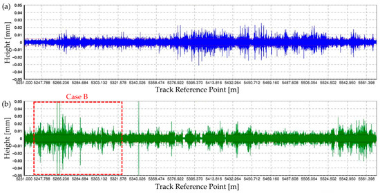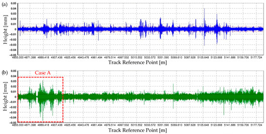 Height profile measured with a trolley in Case B (Pk 5.239–5.326): (a) left rail and (b) right rail.