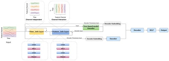 We apply residual connections across both the Time_info layer and the Feature_info layer individually, enabling the network to flexibly learn more important features and capture critical information. These connections also allow the network to avoid redundant computation, thereby improving the efficiency of learning within deep network architectures. Furthermore, we treat the tree-based model as an encoder, utilizing it as an effective tool for feature extraction. Specifically, the tree-based model employed in this study is LightGBM [], a machine learning model that implements the Gradient Boosted Decision Tree (GBDT) algorithm. Proposed by Microsoft Research Asia (MSRA), LightGBM optimizes GBDT implementation by retaining samples with large gradients to significantly reduce computational costs. Additionally, it employs a feature bundling technique to handle sparse features, thereby reducing the feature dimensions. These optimizations enable LightGBM to achieve faster training speeds and lower memory usage compared to other frameworks, making it particularly suitable for processing large-scale and high-dimensional datasets. Compared to the level-wise tree growth strategy used in XGBoost [], which splits all nodes at the same depth simultaneously and results in a more balanced tree structure, training on larger datasets is typically slower and has higher resource consumption. In contrast, LightGBM adopts a leaf-wise growth strategy that prioritizes splitting the leaf node with the highest information gain, allowing for faster reduction in the loss function under the same conditions. Additionally, its histogram-based feature binning mechanism significantly reduces memory usage and computational cost. As for CatBoost [], although it employs oblivious tree structures, which provide better stability and reduce the risk of overfitting on small datasets, its training speed is generally slower and memory consumption is higher when applied to larger datasets. Given the structure of our data and the design of our experiments, LightGBM offers a more balanced trade-off between speed and resource consumption, making it a more suitable choice.