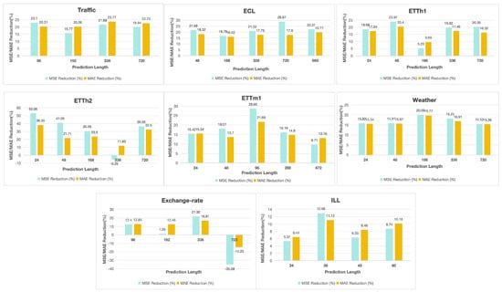 Percentage reduction in MSE/MAE compared to the second-best model across different datasets on different prediction lengths.