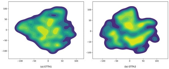 In the ETTh1 dataset, which exhibits distinct seasonal hierarchies (i.e., different seasonality levels), we observe that although the overall prediction performance improves, at the prediction length of 168, the improvements are modest, with MSE reduced by only 5.29% (1.096 → 1.038) and MAE by 9.69% (0.837 → 0.756), suggesting limited effectiveness under this prediction horizon. For other prediction lengths, such as 48 and 720, MSE decreases by 23.97% (0.722 → 0.549) and 20.35% (1.371 → 1.092), while MAE decreases by 20.4% (0.647 → 0.515) and 16.32% (0.950 → 0.795), respectively. This variation in improvement may be attributed to the fact that a prediction horizon of 168 aligns with a full weekly cycle. From a daily time scale perspective, it represents a relatively long forecasting span, whereas from a weekly perspective, it marks the beginning or end of a complete cycle. In contrast, a prediction length of 336 allows the model to capture longer-term temporal interactions, facilitating the learning of cross-week trends more effectively. However, as shown in Figure 3, in the multivariate feature space, the t-SNE [] and kernel density estimation (KDE) visualizations reveal that ETTh2 gives a more scattered and fragmented sample distribution compared to ETTh1. Specifically, the high-density regions in ETTh2 are more widely separated, with multiple blurred boundaries along the edges, indicating lower compactness and similarity among samples in the low-dimensional space. This reflects weaker inter-variable correlations and more unstable temporal structures. In the original multivariate space, such characteristics may correspond to higher noise levels or stronger non-stationarity, which increases the modeling difficulty. In contrast, the sample distribution of the ETTh1 dataset appears more cohesive and smooth, with multiple high-density regions closely clustered together. These locally cohesive patterns suggest that the time series exhibits stronger temporal regularity (e.g., periodicity). For datasets like ETTh1, which display significant periodicity, the corresponding attention mechanism is better able to stably focus on critical time points, thereby capturing temporal dependencies more effectively and achieving higher predictive accuracy.