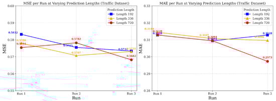 MSE and MAE results across three runs at different prediction lengths on the Traffic dataset.