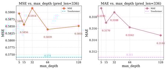 In our original experimental configuration, the maximum tree depth was left unspecified. This was intended to demonstrate that the maximum tree depth was unconstrained, allowing the tree-based model encoder to determine the optimal depth based on the data and its pruning strategy. Unlike traditional level-wise algorithms such as XGBoost, LightGBM adopts a leaf-wise growth strategy that prioritizes splitting the leaf node with the highest potential to reduce the loss function. This can result in some trees growing very deep, but often leads to better overall performance. As a result, max_depth is typically used as the default setting in practice, allowing the model to grow adaptively based on the data. The official practical documentation also highlights this parameter, noting that limiting it is commonly used to reduce the risk of overfitting on small datasets. This choice was motivated by the need to ensure model adaptability across datasets from different domains, as a fixed structural configuration may fail to generalize well. The default depth-setting strategy provides greater flexibility and robustness in such varied scenarios. To evaluate the impact of structural depth on model performance, we conducted an ablation study on the parameter: structure depth (max_depth), while fixing the branching factor (num_leaves) at 64. We tested five depth values: {5, 15, 32, 64, 128}. All ablation experiments in this section adopt a unified prediction setting: a prediction length of 336 on the Traffic dataset. The results of the experiment are illustrated in Figure 5, where the original Treeformer setting (with default max_depth) remains the best-performing configuration overall. Although slight fluctuations are observed across different depths, it is evident that the performance at max_depth = 64, 128 is slightly better than at max_depth = 5, 15, or 32, indicating that forecasting performance is indeed sensitive to tree depth. The lowest MSE is achieved at max_depth = 64, and increasing the depth further to 128 offers limited additional benefit, suggesting diminishing returns with deeper trees. In terms of MAE, both max_depth = 64 and 128 also yield strong performance, falling within the peak performance range, but may stem from an overfitting effect.